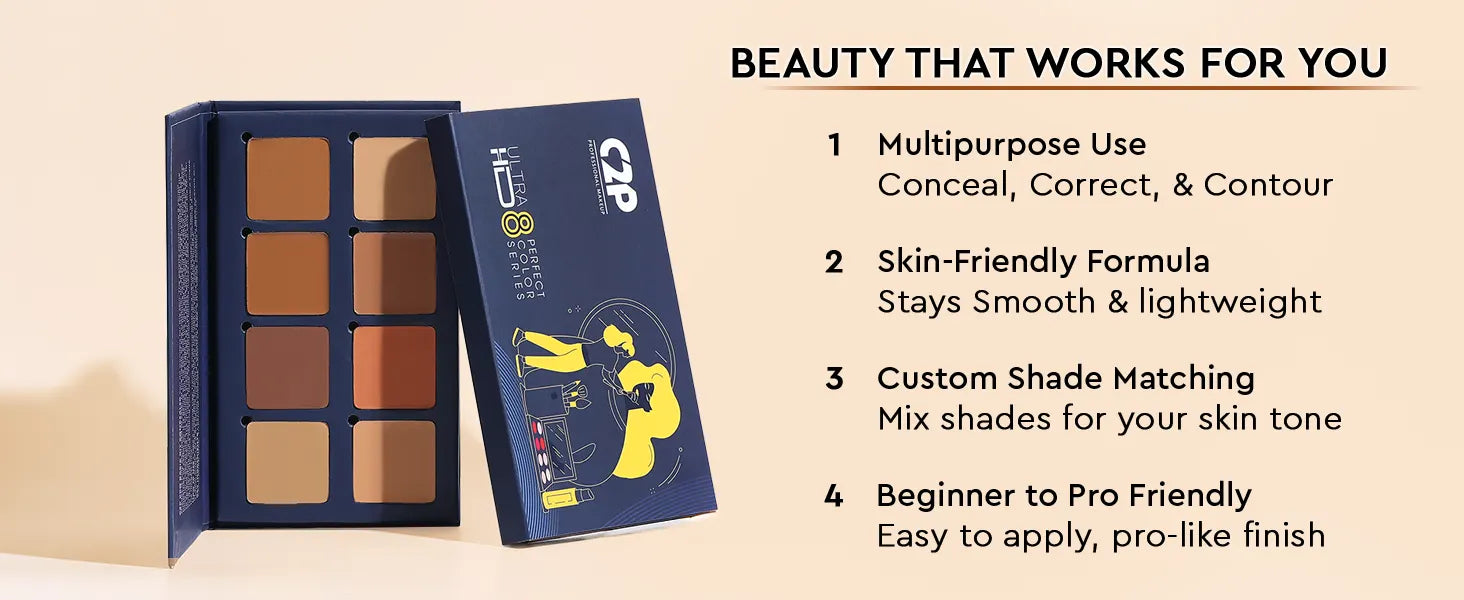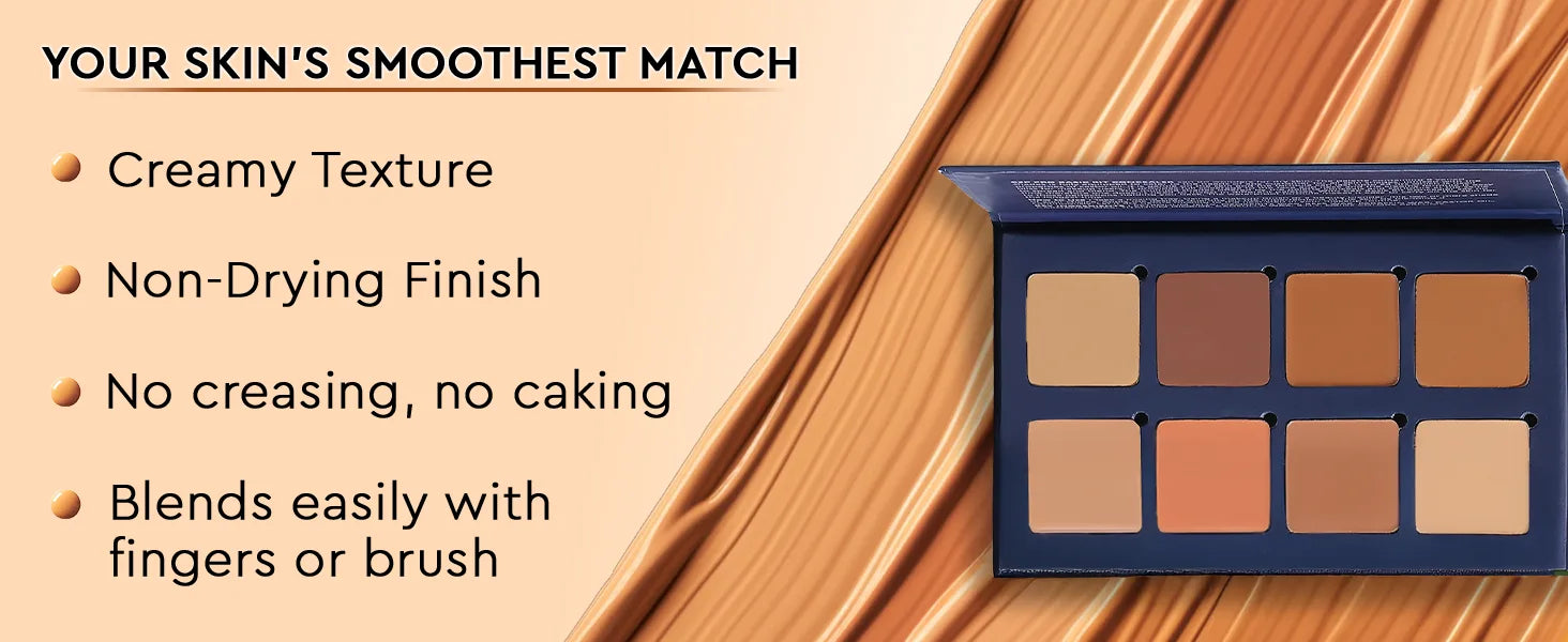 An all-in-one cream concealer palette featuring 8 versatile shades that effortlessly correct, conceal, contour, and highlight in one compact. The buildable medium-to-full coverage blends smoothly into the skin for a flawless finish, while the lightweight, non-cakey and skin-friendly formula ensures comfortable wear all day.