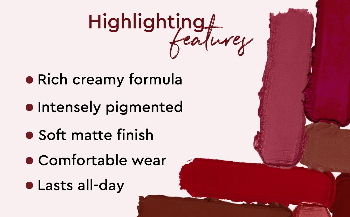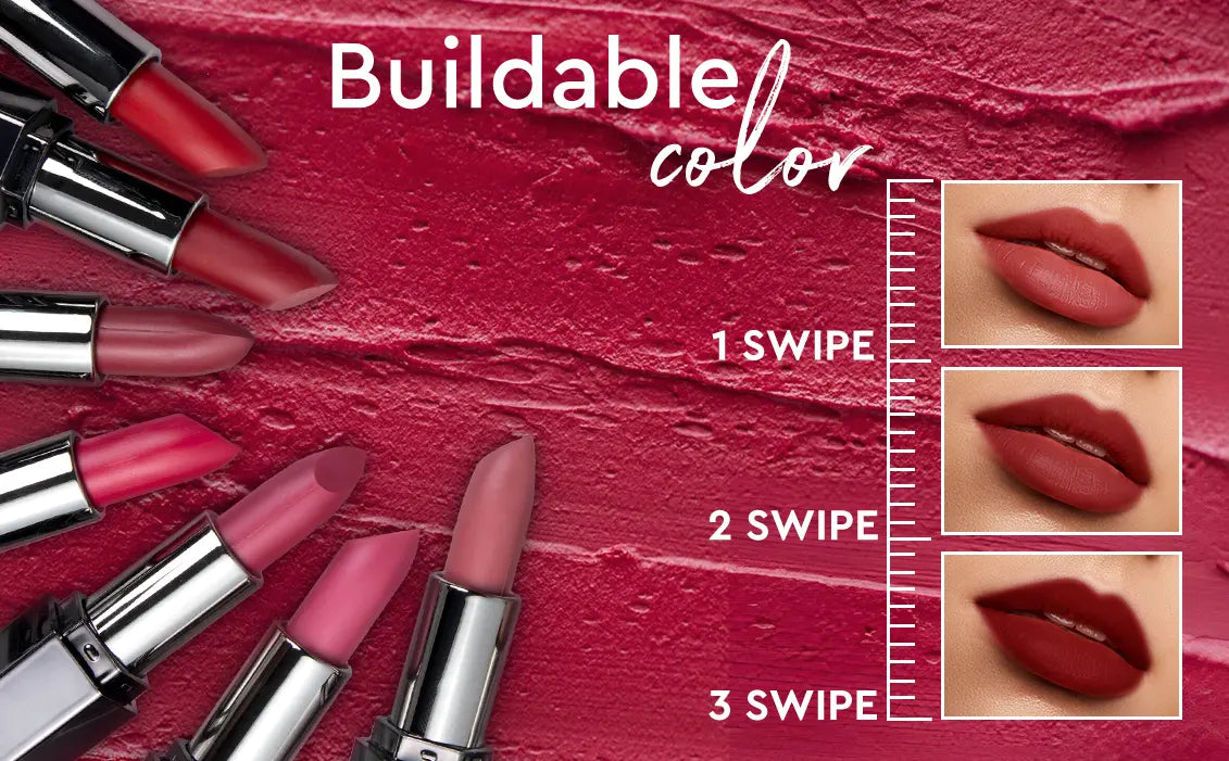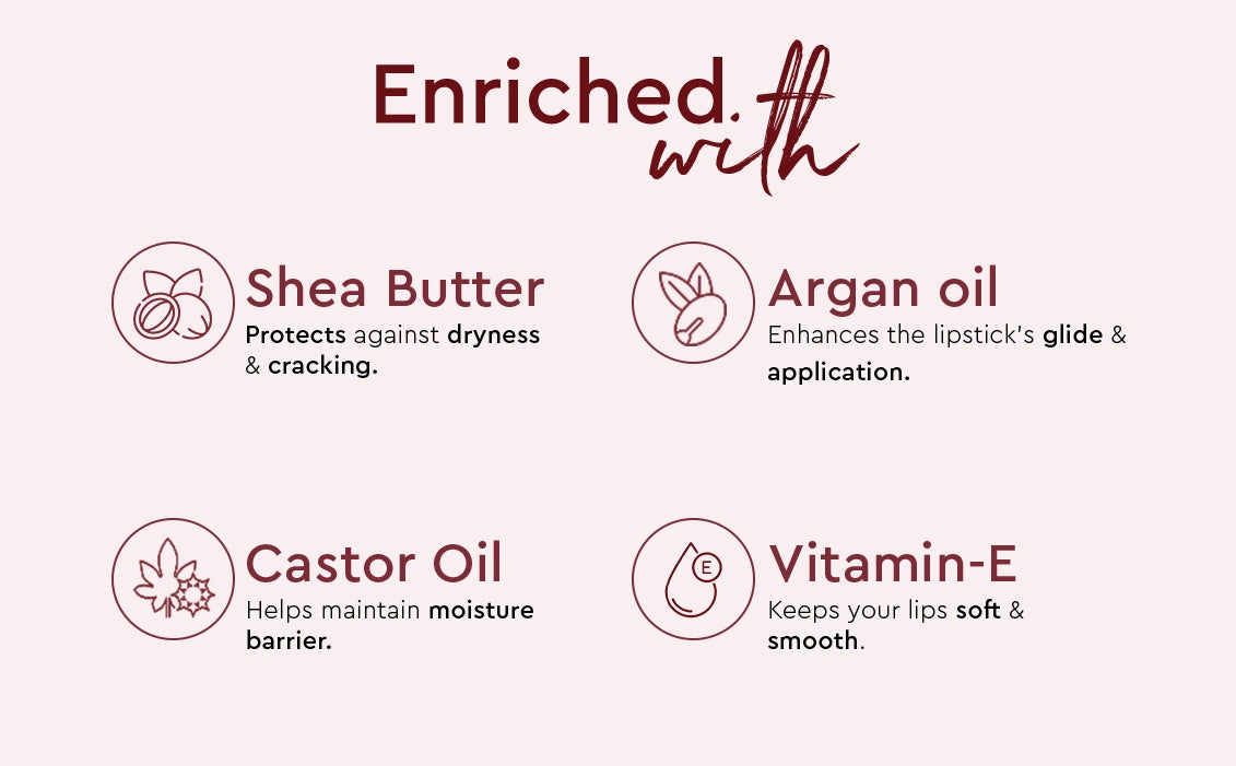 The intense pigmentation ensures a long-lasting, wear that lasts throughout the day. Infused with nourishing ingredients like vitamin E, shea butter, Argan Oil, and Papaya Seed Oil this lipstick hydrates and nourishes your lips, leaving them feeling soft and supple.